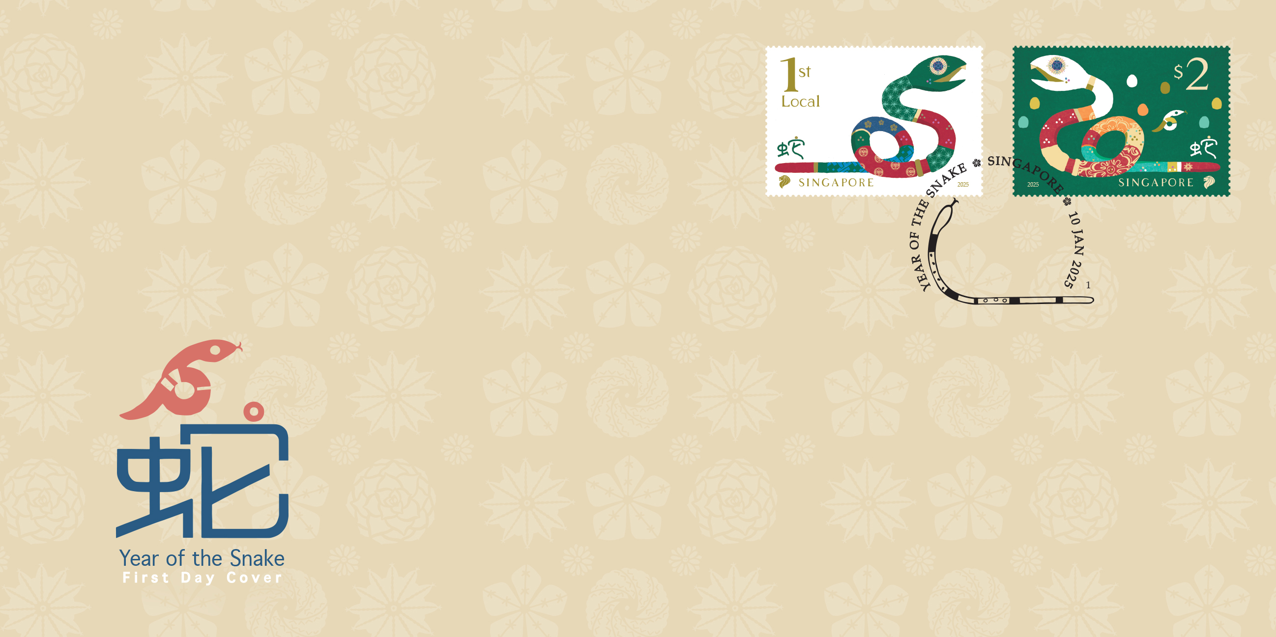 The Pre-cancelled First Day Cover affixed with the complete set of stamps and cancelled with a special Zodiac Snake postmark will be sold at $4.05. The Presentation Pack containing both stamps is priced at $5.10.